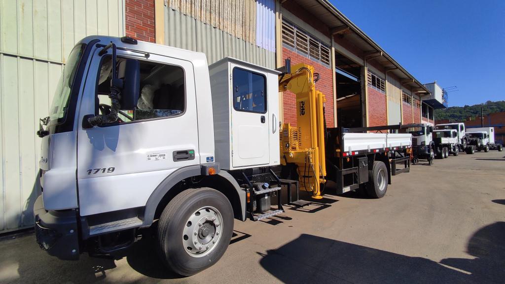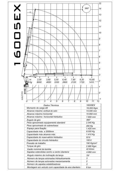 Composto de três lanças hidráulicas e duas lanças manuais, indicado para caminhões com PBT mínimo de 6 ton. no eixo dianteiro. Com extensão hidráulica das Sapatas dianteiras, extensão manual das sapatas traseiras, horímetro, manômetro, tomada de força, bomba hidráulica, óleo hidráulico e sobre chassis. Podendo ainda ser equipado com os seguintes acessórios: controle remoto, limitador de momento de carga, malhal metálico, guincho de cabo com capacidade para 1.5 ou 3 toneladas, porta palletes e extensão hidráulica das sapatas traseira.