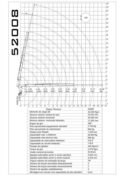 Composto de cinco lanças hidráulicas e três lanças manuais, indicado para caminhões com PBT mínimo de 6 ton. no eixo dianteiro. Braços das sapatas dianteiras telescópicos com sistema de extensão hidráulica, extensão hidráulica dupla das sapatas traseiras, sistema de rolamentos axiais na coluna de giro, com horímetro, manômetro, tomada de força, bomba hidráulica, óleo hidráulico e sobre chassis. Podendo ainda ser equipado com os seguintes acessórios: controle remoto, limitador de momento de carga, malhal metálico, guincho de cabo com capacidade para 1.5, 3 ou 5.8 ton e porta palletes.